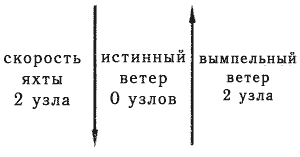 Самой наглядной иллюстрацией изменения скорости вымпельного ветра относительно истинного может служить движение яхты точно на фордевинде. Если яхта идет со скоростью 2 узла по ветру 6 узлов, то он догоняет ее со скоростью 6-2 = 4 узла На рис. 12 схематически показан этот простой случай. Если лодка оснащена двигателем и идет со скоростью 2 узла строго по ветру, то скорость вымпельного ветра будет 6 + 2 = 8 узлов. Если в абсолютный штиль, при ветре "0", яхта буксируется со скоростью 2 узла, то на ней будет ощущаться ветер, равный 2 узлам и противоположный направлению движения яхты. Это показано на рис. 13.