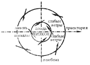 Рис. 54. Упрошенная схема депрессии, изобары расположены вокруг области низкого давления. Ложбина находится под прямым углом к траектории, ветер дует против часовой стрелки к центру циклона.