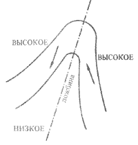 Ложбина. Показана на рис. 56. Область низкого давления, проникшая между двумя районами высокого давления. Вдоль оси ложбины наблюдаются шквалы и резкие изменения направления ветра (см. также рис. 65).