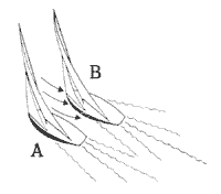 Рис. 57. В этой ситуации яхта В несомненно должна немного уйти под ветер и обогнуть знак по самой плавной кривой, а затем сменить галс, чтобы пройти вначале длинный галс. |