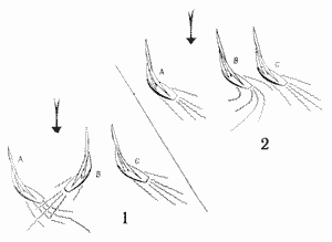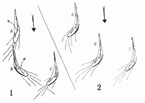 Рис. 51. Этот маневр применяется для укрепления лидирующего положения, когда вас преследует только один противник. Он осуществляется при постоянном ветре и отсутствие течения, которое могло бы сделать один из галсов более выгодным. Недостаток его в том, что он уменьшает отрыв на два корпуса, если второй швертбот идет тем же галсом после огибания знака. Я считаю, что это не очень спортивно. По-моему, лучше смотреть вперед и стараться быстрей достигнуть следующего знака, чем мешать другим. |
