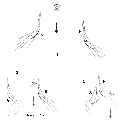 Рис. 80. Яхта В должна идти своим курсом, пока А не сменит галс. Затем яхта А должна будет перед новым поворотом набрать ход и потеряет на этом маневре до десяти корпусов, в то время как В - только один корпус. |