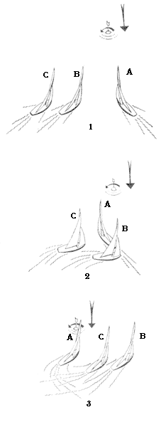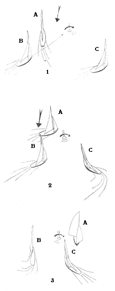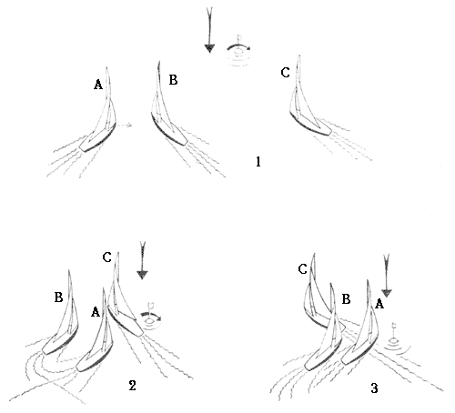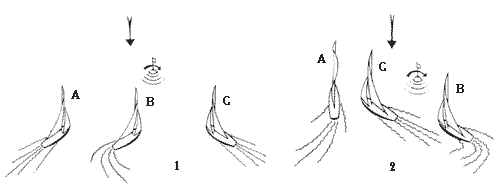 второй, если повернет вовремя, как показано на рисунке (3), когда С не может сменить галс из-за