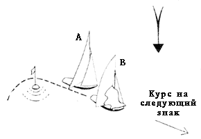 знак, подобно яхте С, теряет высоту. Яхта В огибает знак, как обычно это делают не очень опытные