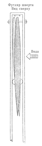 Рис. 6. Это приспособление имеет большое значение для коротких швертботов, таких, как "5-0-5". Оно помогает им лучше идти на встречных курсах. С помощью этого приспособления шверт автоматически может встать под углом в 2-3 градуса на ветер относительно осевой линии судна, что помогает корпусу идти прямо, а не вбок.