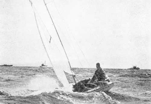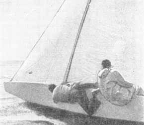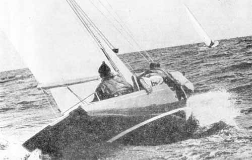 Чемпион мира 1966 г. в "5,5-метровом" классе. На лавировке в большую волну вес экипажа правильно вынесен за борт. Рулевой хорошо видит море, паруса и может наблюдать за ветром. Он управляет судном с помощью удлинителя руля.